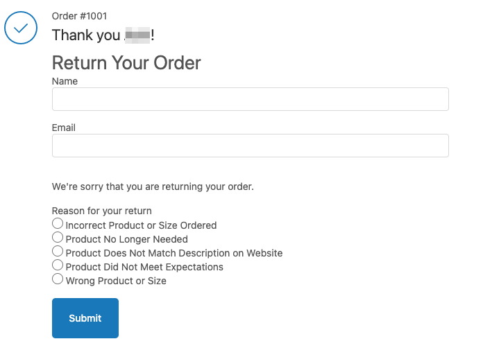 Your order return form will appear on the order status page after a customer places an order.