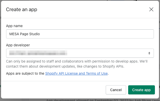 In the modal window, enter the App name and select an App developer. The app developer can be the store owner, or any staff or collaborator account with the Develop apps permission.