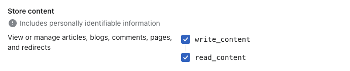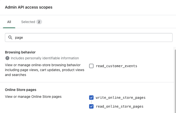 Search for "page" and select the write_online_store_pages and read_online_store_pages scope.
